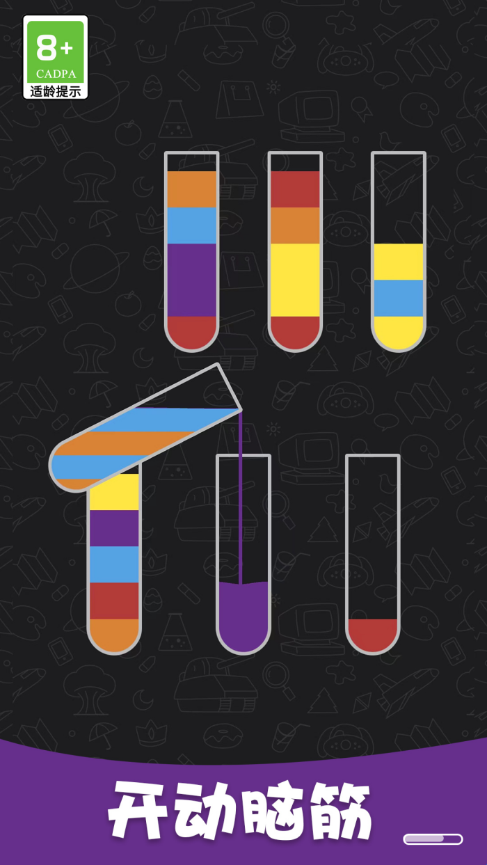 1、了解基本操作:点击试管,控制其倾斜角度,将水液倒入其他试管或容器中。注意,只有相同颜色的水液才能互相倾倒。