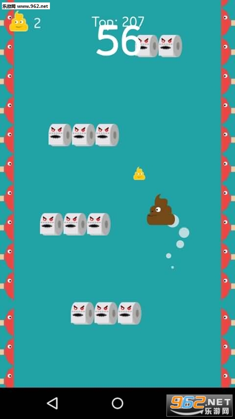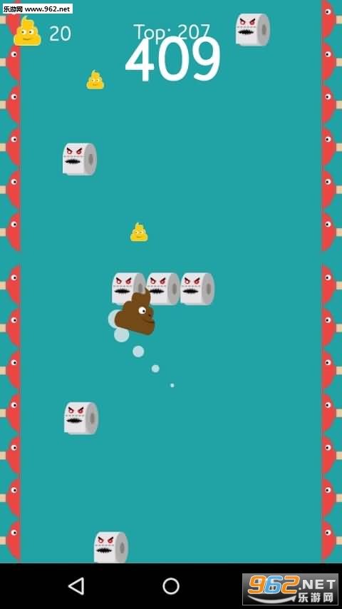 飞翔时刻安卓版是一款小巧趣味的敏捷类休闲手游,游戏中玩家将帮助一坨便便不断的向上飞跃,你需要通过不断的点击屏幕让便便转向,不能碰到两侧的马桶栓,也不可以碰到中间的卫生纸,同时还需要注意收集小便便来增加获得的分数!