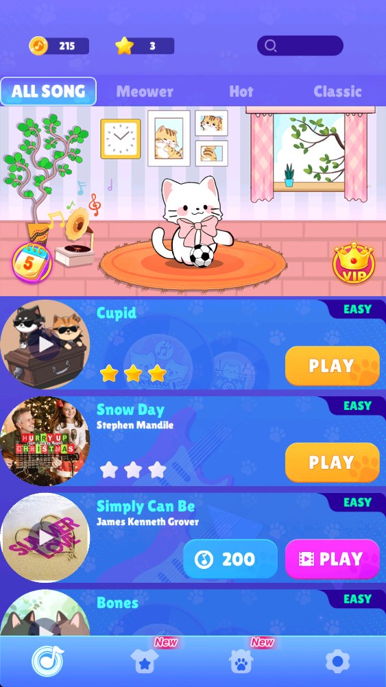 波波猫瓷砖的玩法其实和钢琴块等音乐节奏游戏十分类似,游戏将猫咪的可爱元素与各种不同风格的音乐瓷砖结合在一起,你可以直接选择自己喜欢的音乐进行演奏,通过点击界面上不断下落的瓷砖来完成游戏任务,随着音乐节奏的变化,瓷砖下落的速度也在不断调整,玩家们需要时刻瞄准,不然就要重新开始了,不仅可以锻炼你的反应能力,还可以让你的手指更加灵活哟。