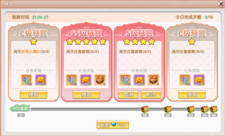 悬赏给的经验和资源丰厚!每天2次免费刷新机会,之后可以使用钻石/绑钻刷新。(悬赏S级奖励4颗星,SS级奖励5颗星,每天10个任务40星数能拿满宝箱奖励。)
