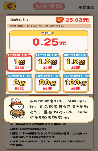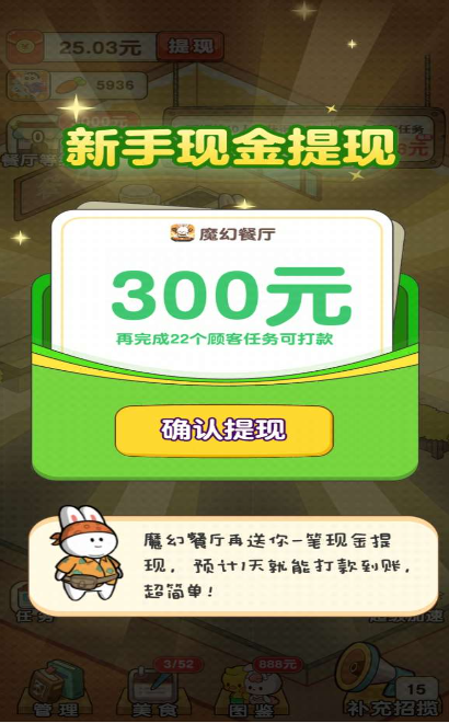 魔幻餐厅红包版是一款经营餐厅赚钱的游戏,整体为卡通风格,玩家们在这里经营着一家美食餐厅,根据到店顾客用餐需求制作美食,每完成一波任务都可以获取奖励,可以用来兑换红包喔!可以直接提现到手机上!以及更多特色任务等你来解锁参与!福利多多,快来下载试试吧!