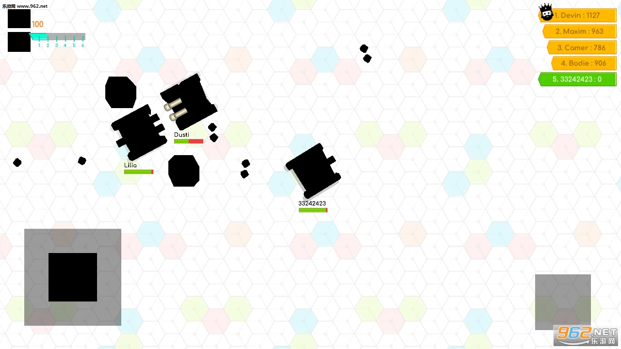 《战斗.io安卓版》(Battle.io)是一款画面简约的多人在线竞技游戏,游戏中玩家将控制一个模拟坦克进行战斗,通过吞噬黑色方块来不断的提升自己的能力,可以发射子弹或者通过撞击来击杀敌人,注意血量归零后你就死亡了。