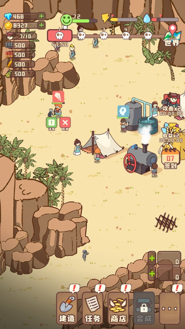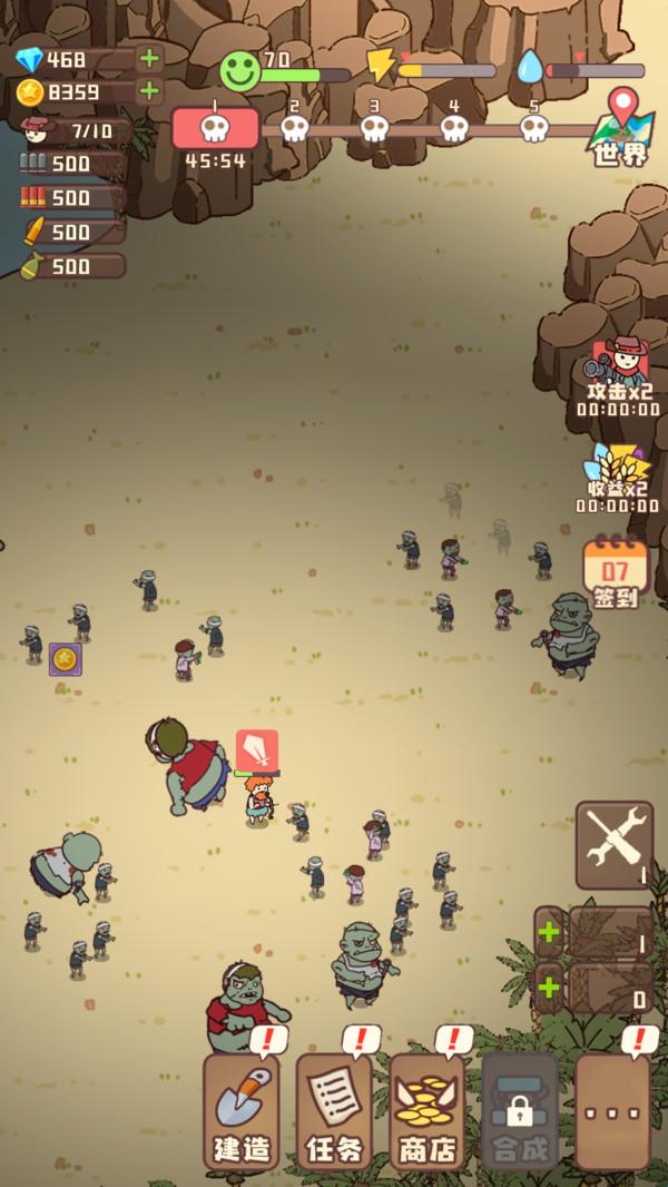 4、村落周围的资源点可以被采集,但采集时可能会遭遇僵尸的袭击,通过建造生产建筑来持续获得资源。