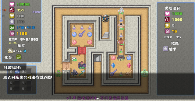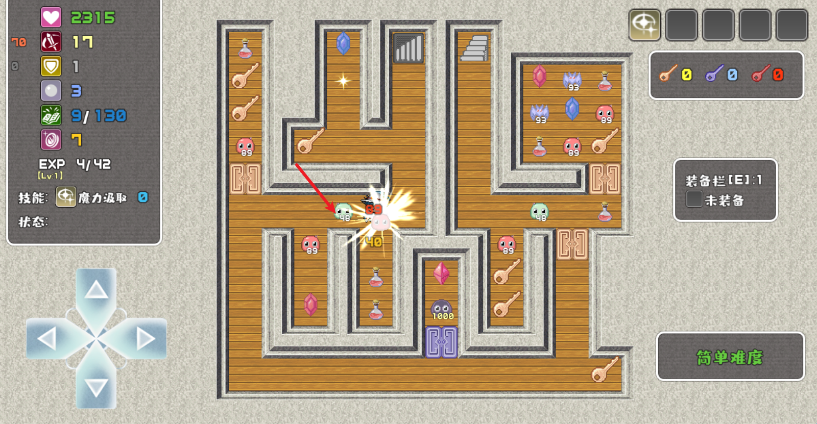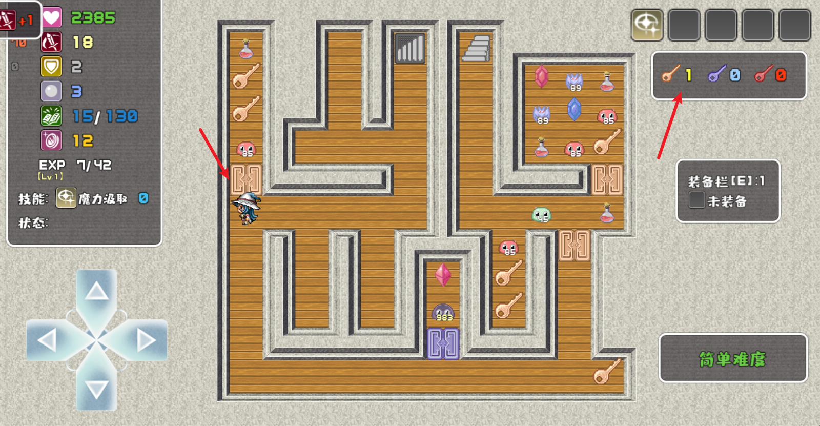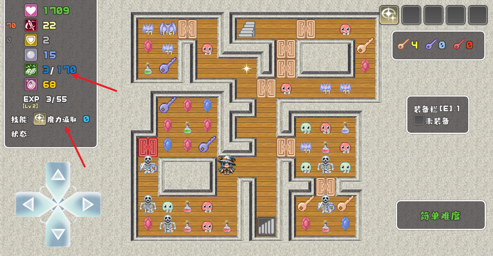 2、左侧可以看到自己的属性,拾取不同颜色的宝石可以提升对应属性,红色宝石增加攻击,蓝色宝石增加防御,绿色宝石可以MP和魔防值。