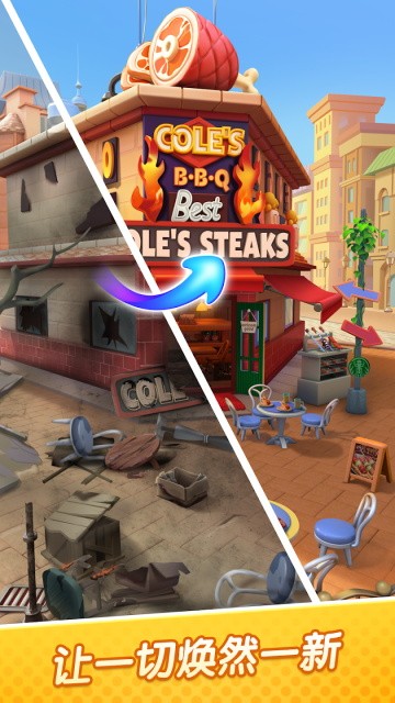 2、重建翻修被烧毁的餐厅,让美食小镇恢复生机