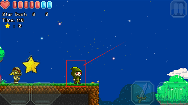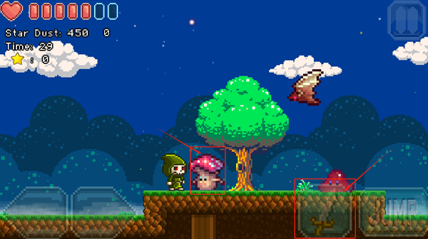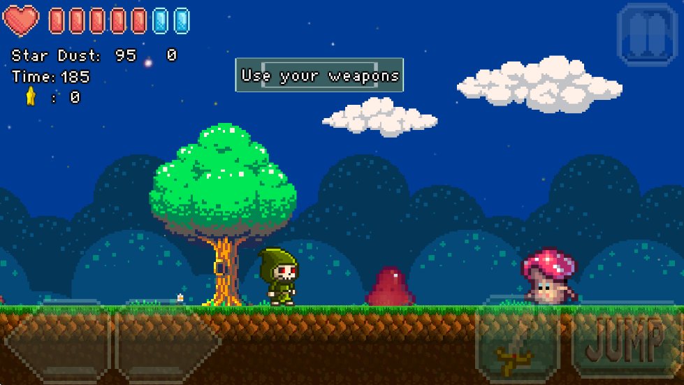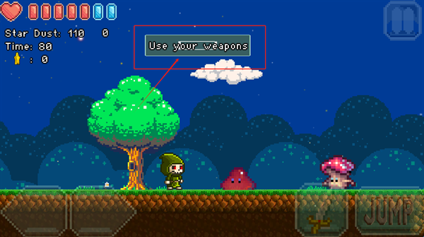 3、根据提示使用武器攻击敌人,按JUMP按钮跳跃,收集星星和道具提升能力。