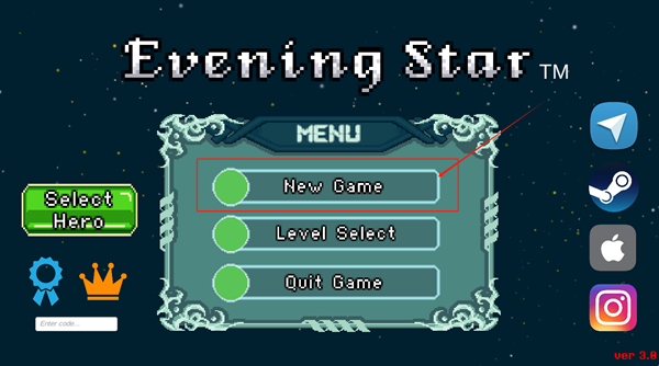 1、主界面选New Game开始游戏,或点Select Hero换角色,右下角看版本号。
