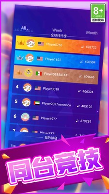 登顶是强者的唯一目标!点击排行榜按钮,直面全球高手的血腥战场!看着榜单上令人窒息的超神分数(973300分只是起点!),你的血液开始沸腾!在“全部”、“周”、“月”三大维度上,与万千玩家展开指尖生死时速!看着自己的名字从寂寂无名一路狂飙,杀入前1.8%,最终剑指那至高无上的0.1%王座!每一颗收集的星星,都是你登顶音游奥林匹斯山的荣耀勋章!