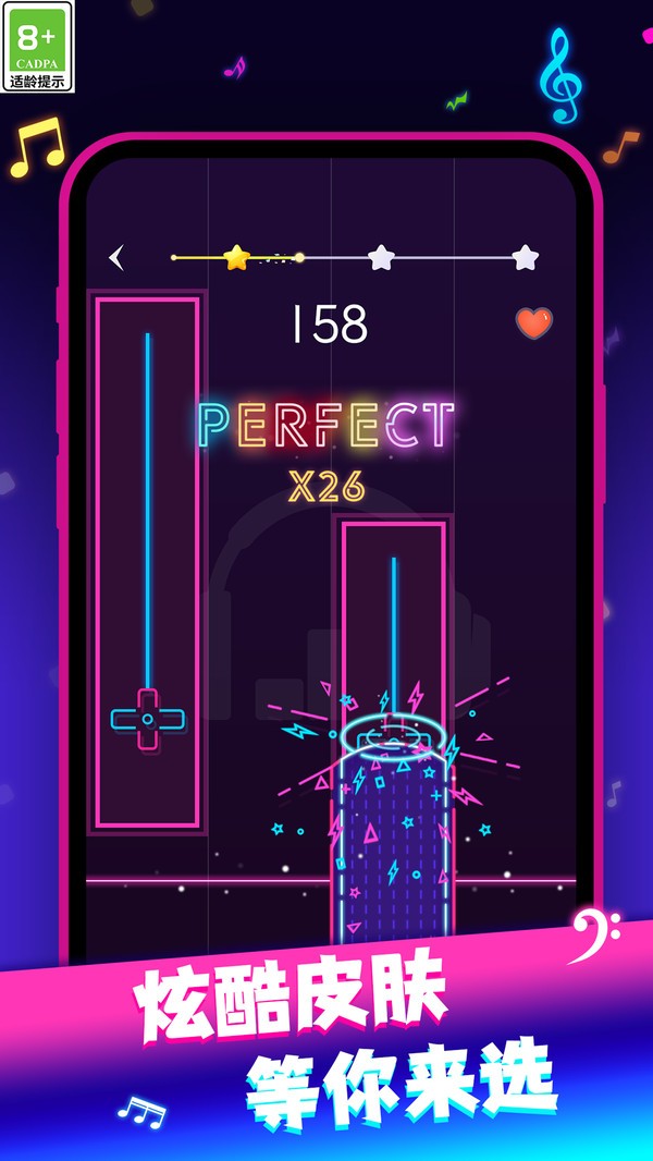 2、丰富的曲库:游戏内置了大量的音乐曲目,包括流行曲、经典音乐、电子音乐等多种风格。玩家可以根据自己的喜好选择不同的曲目进行挑战,每首曲目都带来不同的节奏和难度。