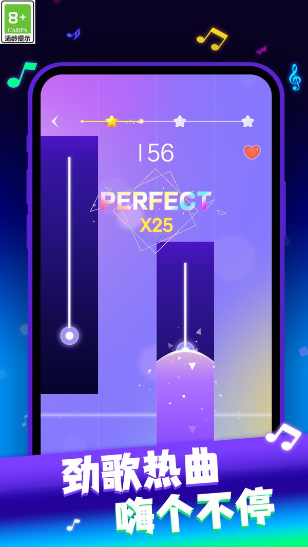 3、随着关卡难度的逐步提升,一心钢琴的玩法要求精准点击音符,锻炼指尖的速度和节奏感。