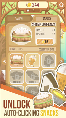 解锁您理想的游戏体验:所有点击器升级项目,自动点播小吃,背景和配件最终都可以通过整个游戏中的星星免费在游戏中解锁。对于所有饥饿的大学生在那里吃拉面,不要担心;