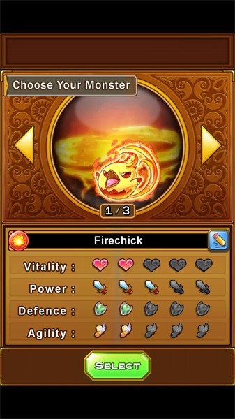 4.进入到选择宠物界面,有3种宠物可供选择,每种宠物的属性都不一样,选择后,点击SELECT