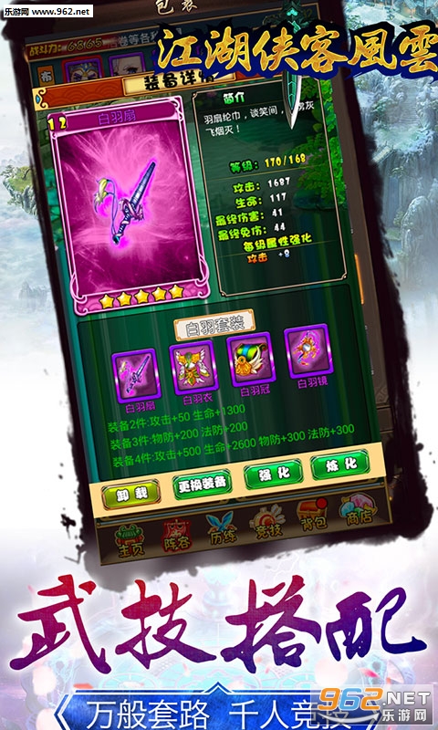 游戏采用国韵水墨画风格打造,在这大千世界当中,多种门派可自由选择学习武功秘籍,惩奸除恶华山之巅决一雌雄,谱写一段全新的武林风云。
