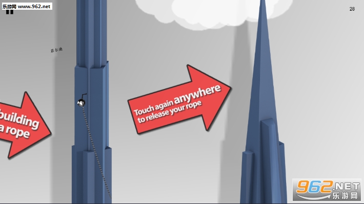 《空中飞人手游》是一款非常有趣的益智休闲游戏。基于物理机制的作用下,玩家需要控制一个火柴人合理运用绳索让火柴人能够随着绳子的摆动在各个高楼建筑上移动,千万要掌握好绳子摆动的节奏,不然让火柴人没顺利的移动在下一个建筑上,则会重重的摔死,游戏会直接结束。