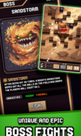 碎砖RPG不仅仅是一款普通的碎砖游戏,它是一款充满RPG元素的街机冒险游戏,拥有丰富的道具选择、角色成长和策略玩法。挑战数百个关卡,征服挑战性的Boss,探索采矿和钓鱼区域,并在无尽模式中检验你的技能。