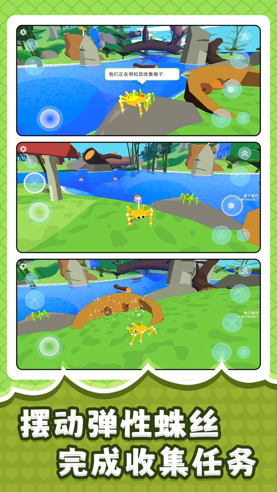 3、帮松鼠收集橡子,完成指定数量任务获取奖励,解锁新皮肤、道具,装扮蜘蛛,让形象更具个性。