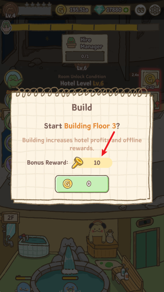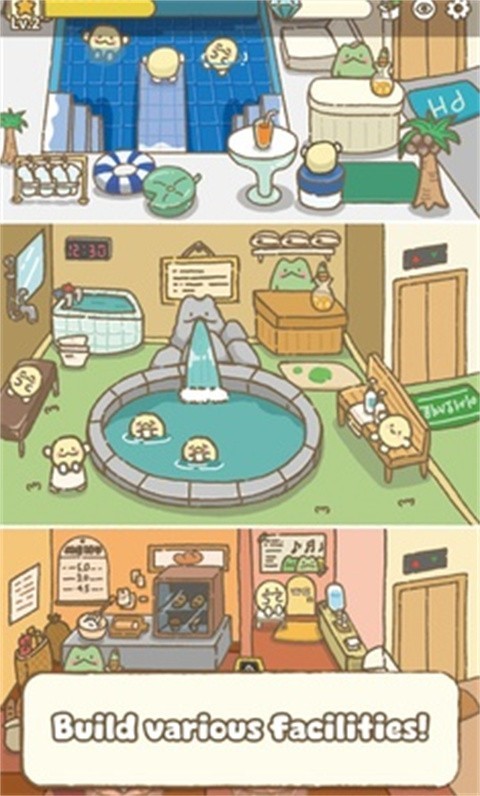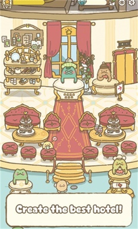 1、经营你自己的青蛙酒店,建设可爱的房间、轻松的装饰和令人身心放松的娱乐设施,招待可爱的动物客人。