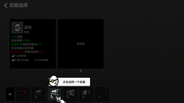 3、选择完角色后可以选择武器,随着技能的解锁,后期可以选择6把武器。