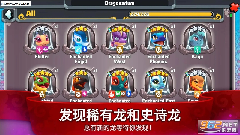游戏中你将发掘这片土地上的每一头龙,并分别将其记录在魔法Dragonarium册里。与其他玩家交换资源,参观他们的龙园,在热闹社区互赠宝石。还有帮你增益龙园的设施如:增效酿制厂和魔法飞艇。通过保存正确的材料,这样就可以定制你的策略。