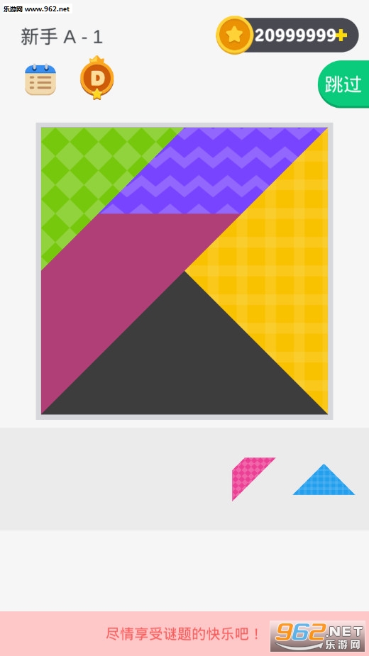 七巧板:游戏的目标是使用所有的板块,将目标区域填满,且在填充时板块不能重叠。