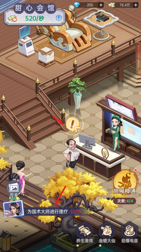 1、在一段剧情之后,我们将会转生成为一家修仙理疗馆的老板,首先根据指引完成对客人的理疗。