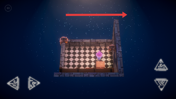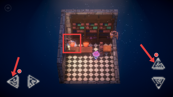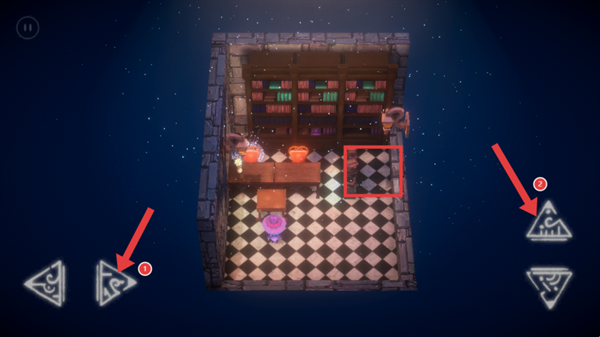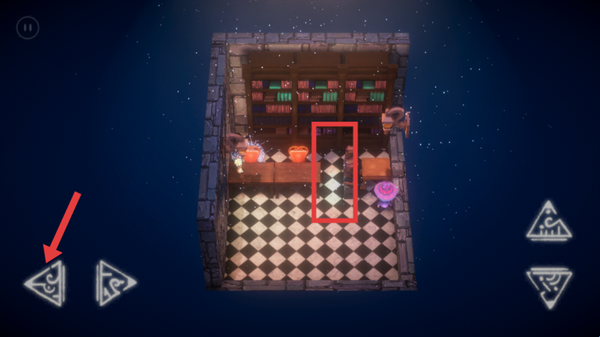 4、最后长按【前进键】移动到书架位置后,在长按【左方向键】移动至方框内【法阵】进入下一关卡。