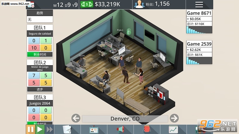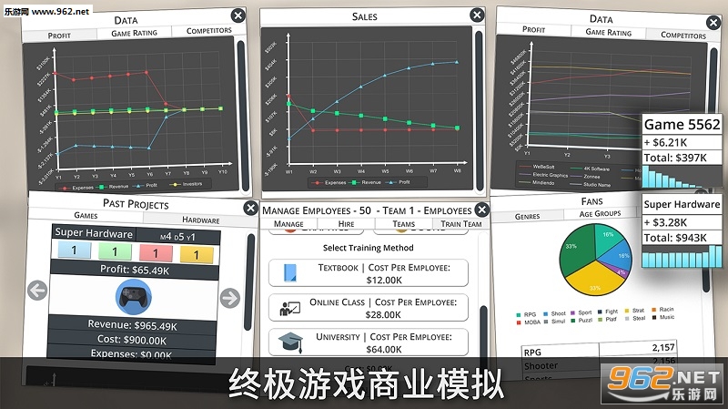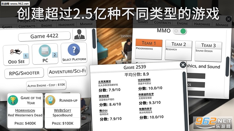 -开创你自己的一个小办公室,发展你的游戏业务,拥有7个建筑,管理50名员工,同时带领3个独立的游戏开发团队开发不同的项目!