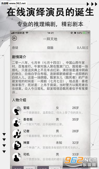 3、探案推理游戏对玩家的逻辑思维要求非常高,精彩剧本、角色扮演,一同秀智商,超多有趣的剧本等你来解谜。