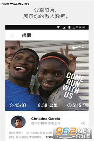 分享你的跑步记录,让朋友一路为你加油,激励你勇往直前。 秀出你的 Nike+ 等级颜色,只要按下按钮,即可通过激励歌曲让自己马力加倍。
