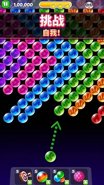 1、控制发射,调整方向发射泡泡,消除相同颜色的泡泡;
