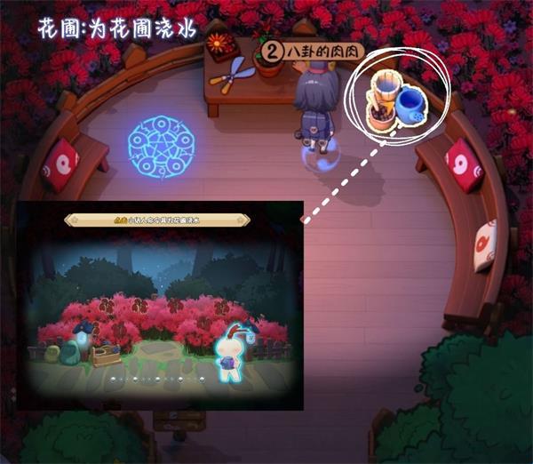 <1>为花圃浇水。进入任务:点击小纸人即可。