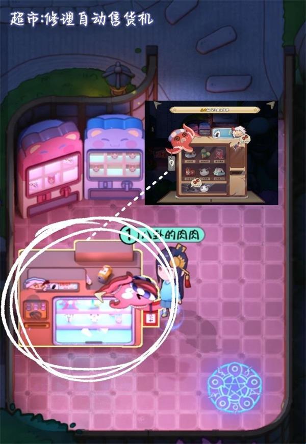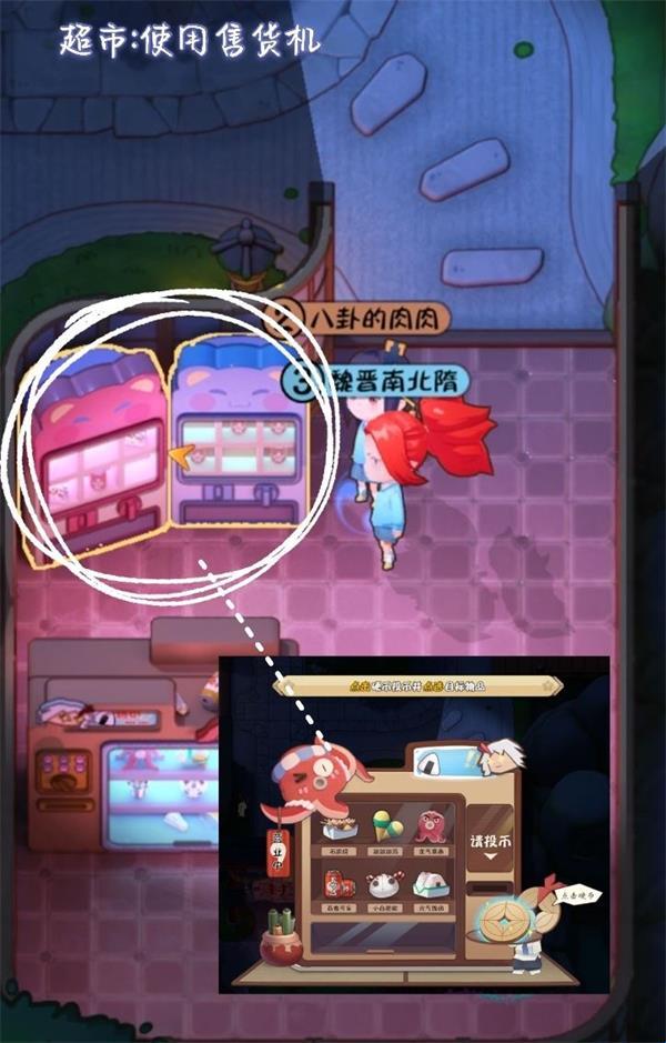 <2>使用售货机。点击投币投进里面点击任务选中的食物即可完成。