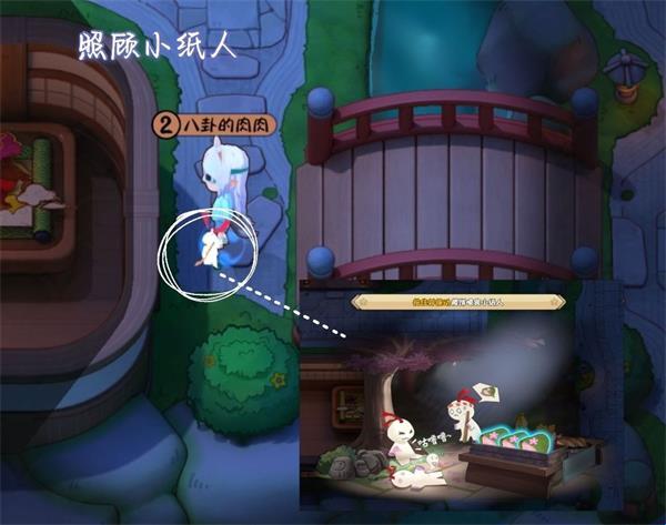 位置:神社大殿——湖畔——休息室(外面)旁边传送门——左侧灯笼旁边——保健室(外面)旁边喂三只纸人吃东西。