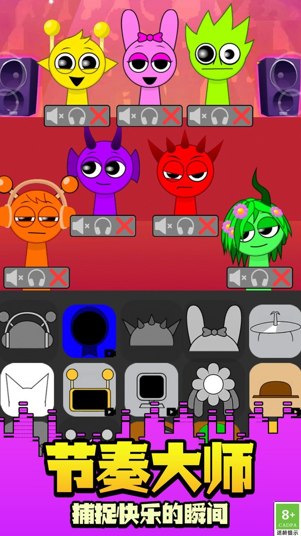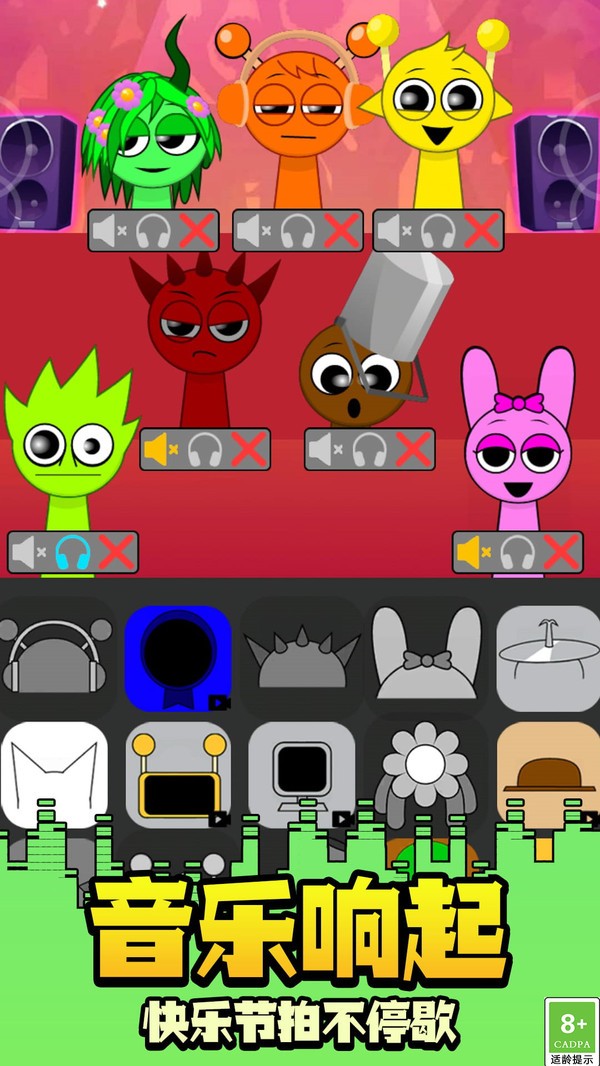 2、不同风格的音效图标,如鼓点、旋律、人声等,拖至角色身上,即可实时生成混合音乐;