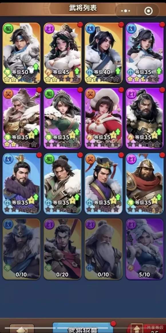 5、BOSS战——与传奇英雄组建强大队伍登录7天即可获得貂蝉、郭嘉等强大的SSR英雄!英雄升级便捷、升级福利共享,无需为资源分配而烦恼、组建强大的队伍,使用自动远征随时挑战世界BOSS,即使离线也能持续收集资源!