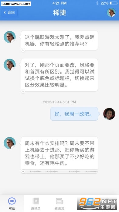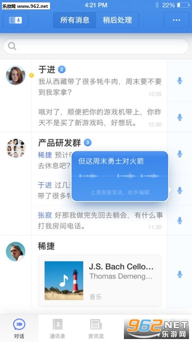 2、快捷回复功能:用户无需进入聊天页面,在 App 的消息列表页面就可以快捷回复消息;列表页面支持直接展开多条未读,可以语音或文字快速回复。用户可以自己选择发送信息的类型,发送语音的同时会自动转为文字并附带,语音识别率高达97%,让用户在不同场景下都有高效的选择;