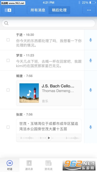 既然生活和工作分不开家,那不如让效率翻倍,在任何聊天界面,用户都可以设置文字消息为稍后处理项,让聊天不再忙乱。