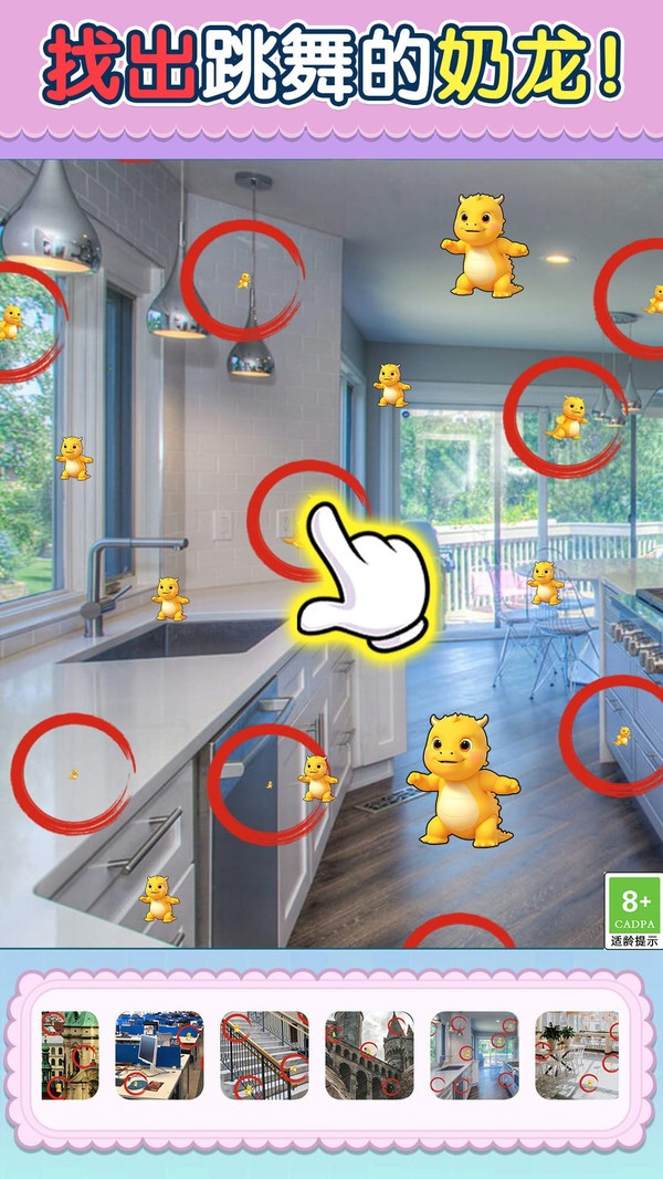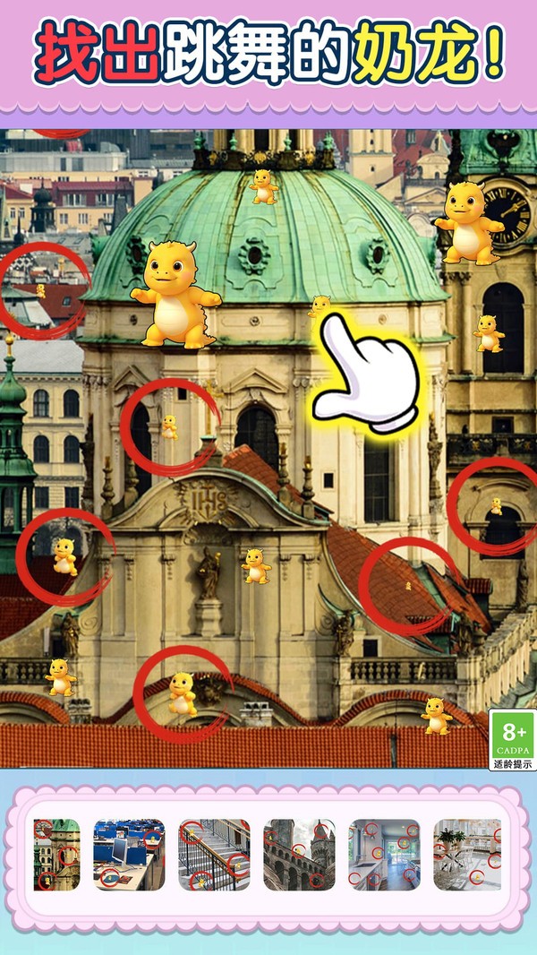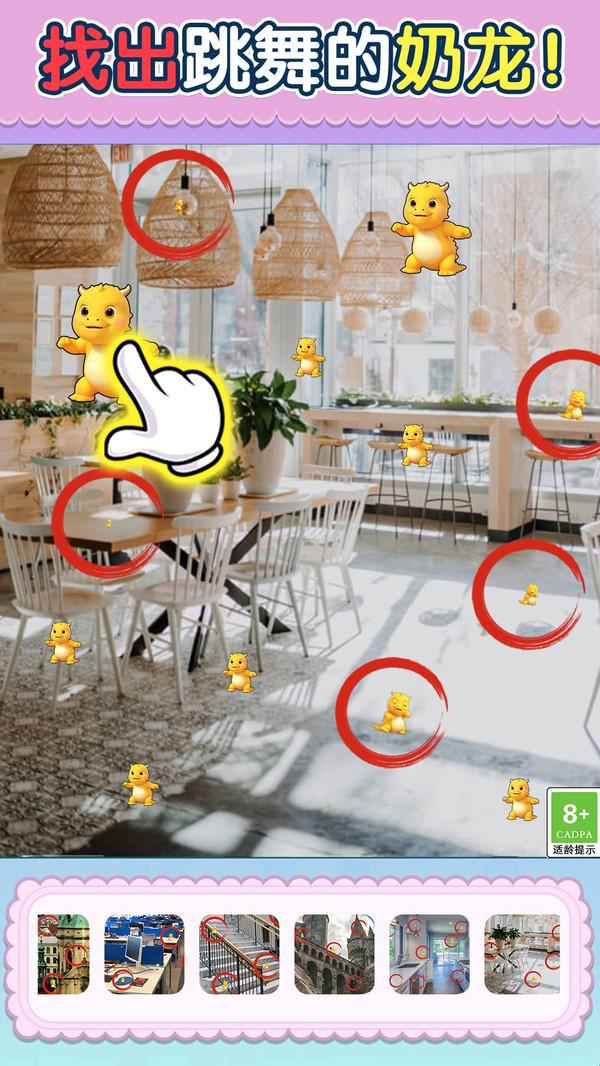 天才千里眼的玩法轻松有趣,可爱的奶龙正在各种不同风格的图片中欢乐跳舞,玩家们要做的就是在不同的场景中仔细观察,并寻找出隐藏其中的奶龙,游戏难度整体不高,各个年龄段的玩家们都可以随时来尝试玩耍,不仅可以锻炼玩家们的观察力和判断力,而且还可以和喜欢躲猫猫的奶龙一起尝试其他的趣味玩法,在游戏中放松你的压力。