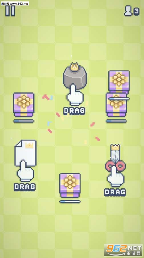 游戏中,合理的管理自己的团队,需要将岩石、文件和剪刀都消灭掉。由童年的石头剪刀布改编,玩法简单易懂,玩家需要滑动屏幕切换和发射卡牌,消灭对应的卡牌获得分数,连击数越高,得分加成越多。