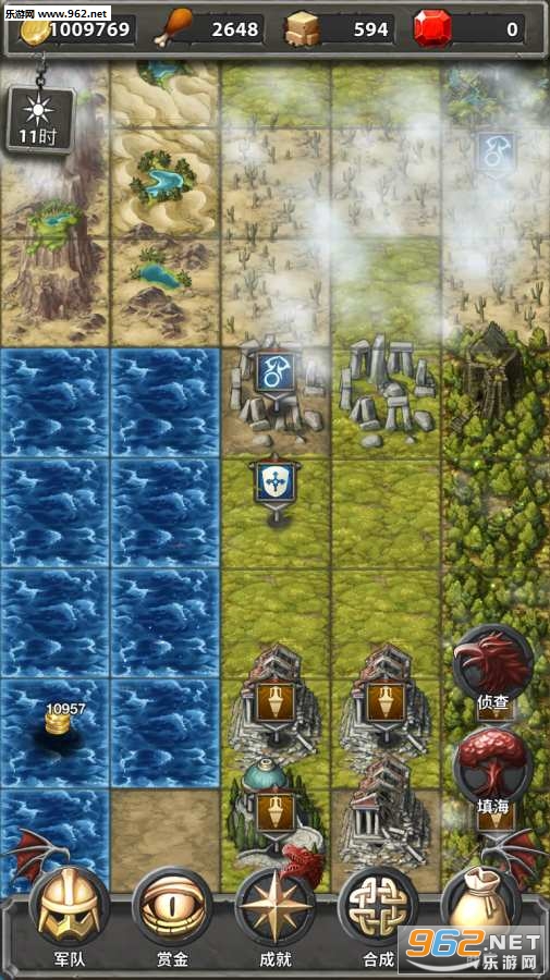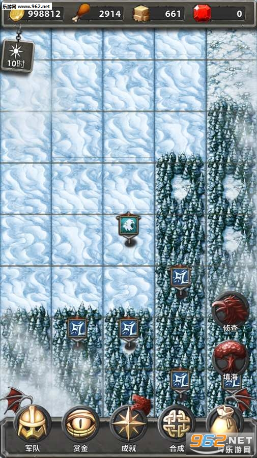 界面自带一个摇摆的时钟,白天节奏比较平和,敌方军团都是固定不动,玩家可以用侦查功能查看对手信息,再决定是否进攻。黑夜降临后,会随机在旷野上生成移动的不死军团,可攻击玩家。在夜晚时间,玩家不能侦查和填海。