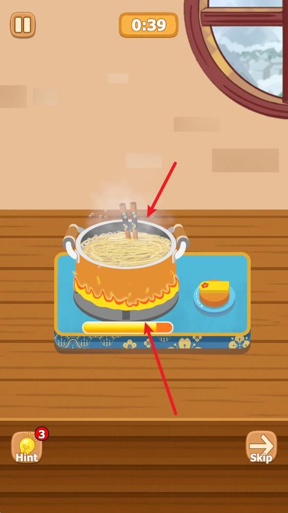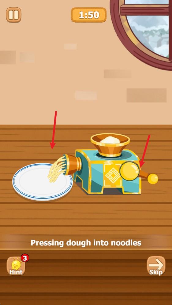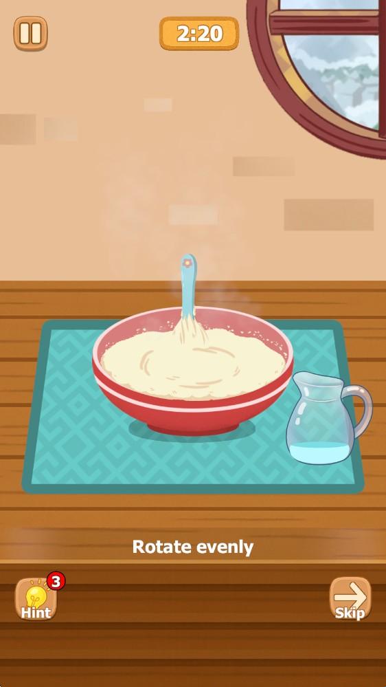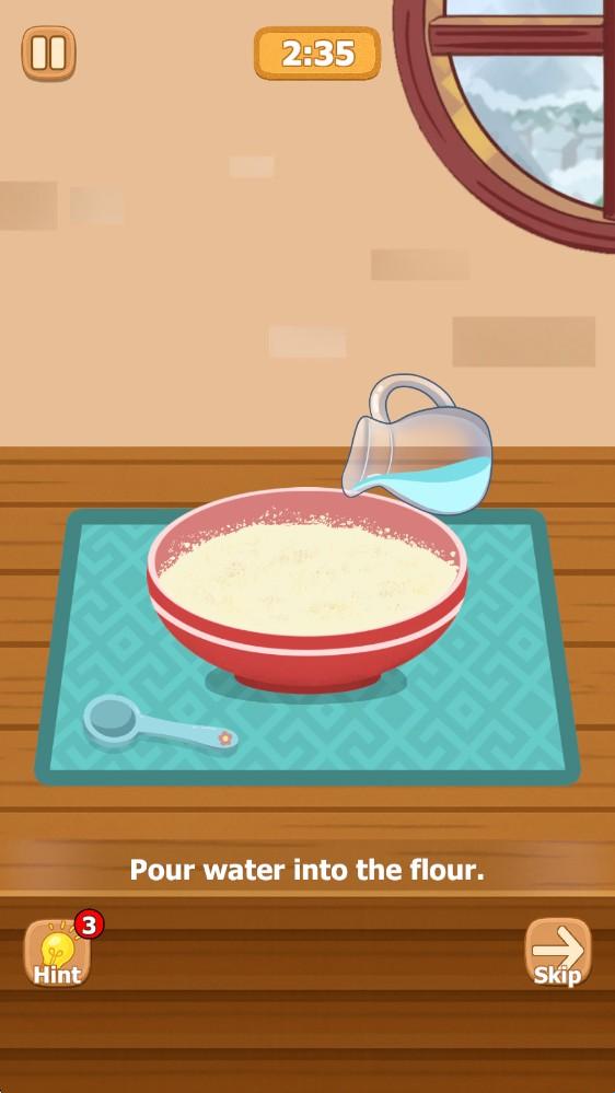 1.以下面这一关为例,首先将水倒入面粉当中,接着将用勺子进行搅拌,直至面粉变成面团。