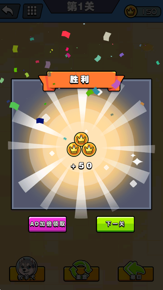 3、挑战【第1关】时,拖动粉色羊羊移动,借助【牧羊犬】功能,或用【重置】【撤回】按钮调整策略。