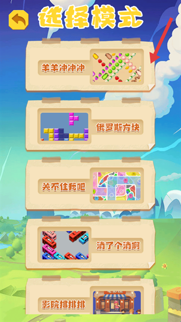 2、在模式选择页,可选【羊羊冲冲冲】【俄罗斯方块】等玩法,点击对应卡片进入对应模式。