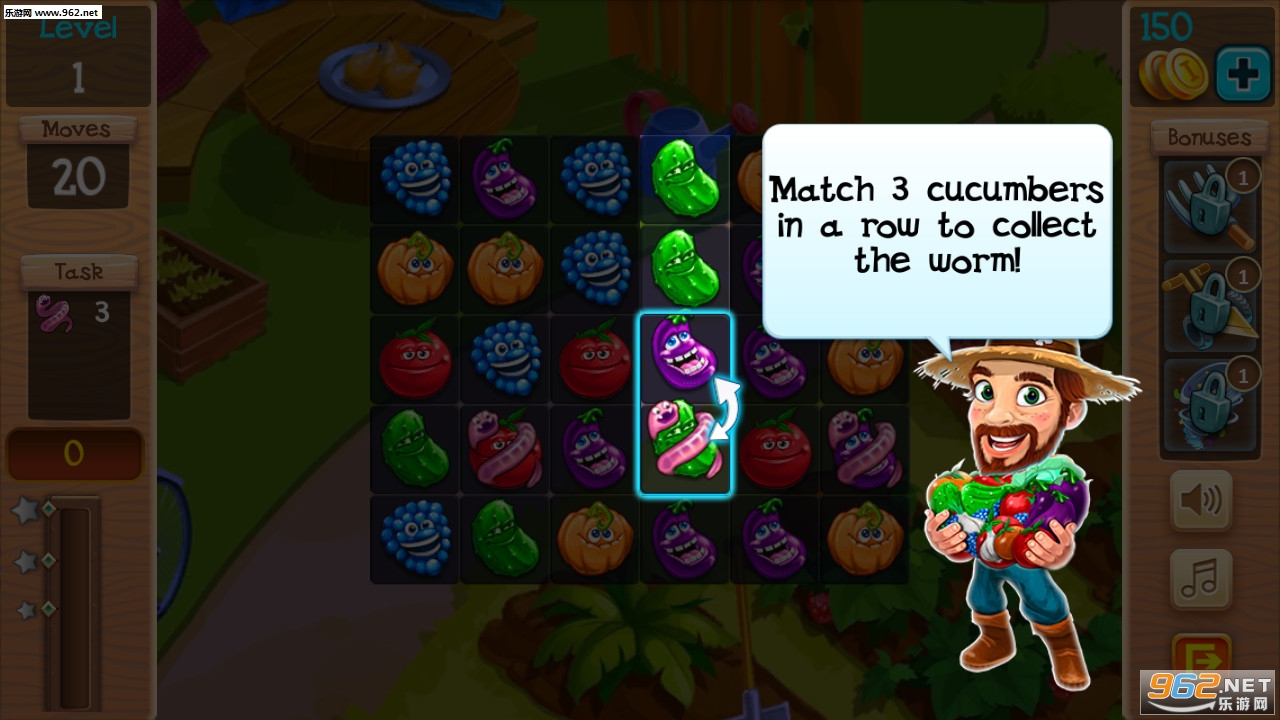 菜园消消乐是一款超好玩的三消游戏。可爱的精美画面、上手很容易、非常可爱的小鱼形象、引人入胜的益智游戏。进入菜园消消乐后你就了解为什么排成菜蔬比排成冷淡的宝石更有兴趣的!而且蔬菜比糖果更有益的!
