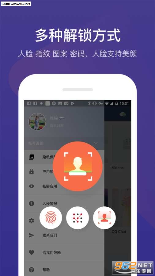 唯秘支持图片、视频及文档的加密存储,数据自动备份永不丢失;应用锁;应用双开;支持免ROOT隐藏应用;支持隐藏联系人;人脸、指纹、图案、密码多种解锁方式;。