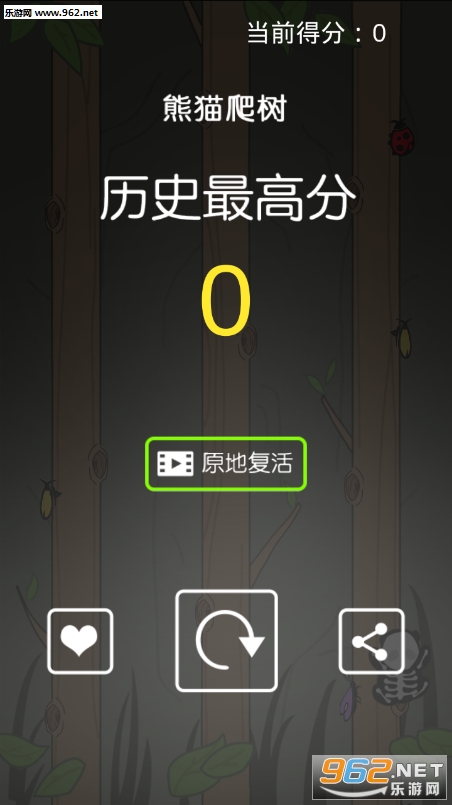 2、游戏界面会有三棵树,你将操控你的小熊猫,在三棵树上跳动,躲避不断涌上来的各种虫子;