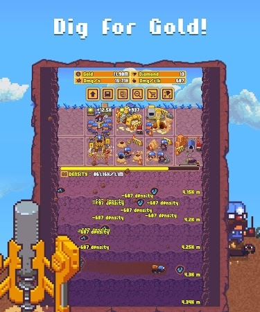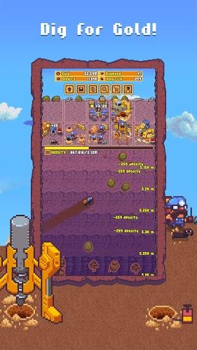 采用纵向单轴挖掘机制,玩家通过点击或滑动屏幕操控挖掘设备向地心方向突破。每次挖掘可获得包含黄金、钻石、煤矿等矿产资源,采集物可通过交易所系统兑换金币用于设备升级。
