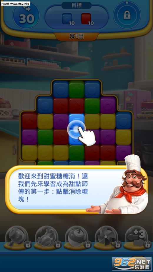 现在就在我们美味的游戏里开始你的大厨生涯吧,你绝不会想错过甜蜜糖糖消!消除至少两个相邻同色糖块来达成目标,通过关卡!记得合理使用强力的道具来通过所有关卡哟!