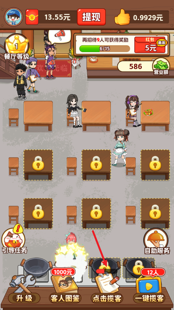 1、进入游戏后,点击右下角的揽客即可吸引客人前来用餐。
