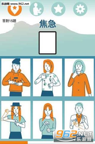 《手语游踪手游》是一款有趣的手语游戏,玩这款游戏,玩家可以一边玩游戏一边学习一些简单的手语,说不定就会用上,游戏中玩家需要根据文字来选择正确的手语图片,然后放入答题框中,正确就会进入下一题,错误就会清空,有时间限制,时间用完之后就会出现分数界面。